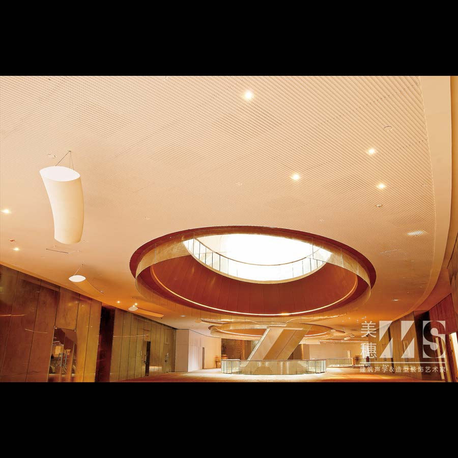 吸音天花通过与后部填充的材料空腔组成一个阻尼系统,声音的能量可以通过此系统将会得到逐步的衰减,从而达到吸音降噪的作用。吸音天花的穿孔率(从低穿孔率3.8%到高达30%的穿孔率)的多类型可以适用于吸收各种频段的噪音、穿孔直径和后部空腔深度容积的多样性,使它可以让使用者“因地制宜”,根据不同空间声音的频率的高低来选择不同式样的吸声板。